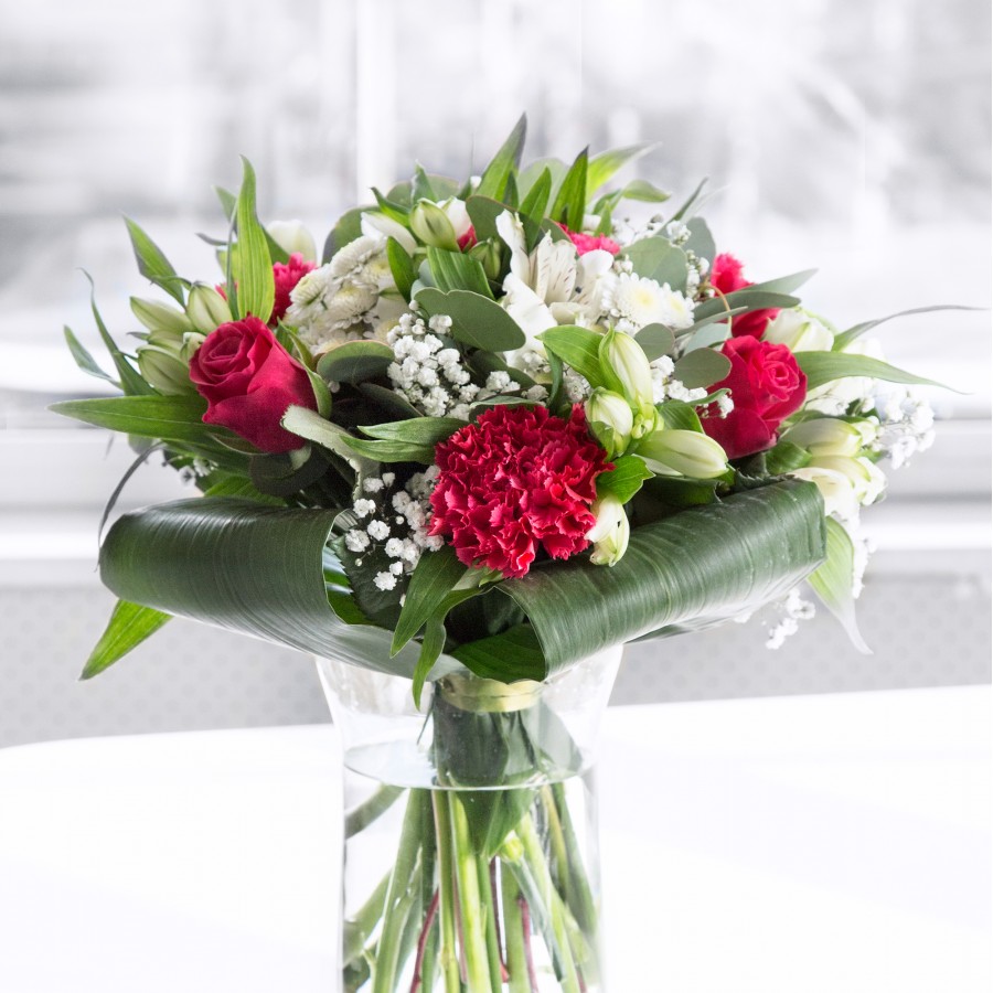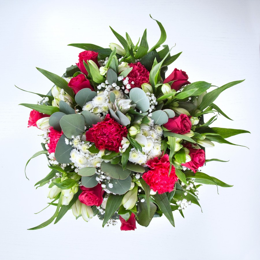 Our bouquet is a masterpiece of floral artistry, combining white chrysanthemums, delicate gypsophila, bold red roses, vibrant carnations, elegant white alstroemeria, and rich aspidistra leaves. Each flower is hand-selected to ensure maximum freshness and visual appeal.
